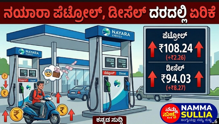 • ನಯಾರಾ ಎನರ್ಜಿಯಿಂದ ದಿಢೀರ್ ಬೆಲೆ ಏರಿಕೆ: ಭಾರತದ ಅತಿ ದೊಡ್ಡ ಖಾಸಗಿ ತೈಲ ಮಾರಾಟ ಕಂಪನಿಯಾದ ನಯಾರಾ ಎನರ್ಜಿ (Nayara Energy) ಇಂದು ಪೆಟ್ರೋಲ್ ಬೆಲೆಯನ್ನು ಲೀಟರ್‌ಗೆ ₹5 ಮತ್ತು ಡೀಸೆಲ್ ಬೆಲೆಯನ್ನು ಲೀಟರ್‌ಗೆ ₹3 ರಷ್ಟು ಹೆಚ್ಚಿಸಿದೆ.