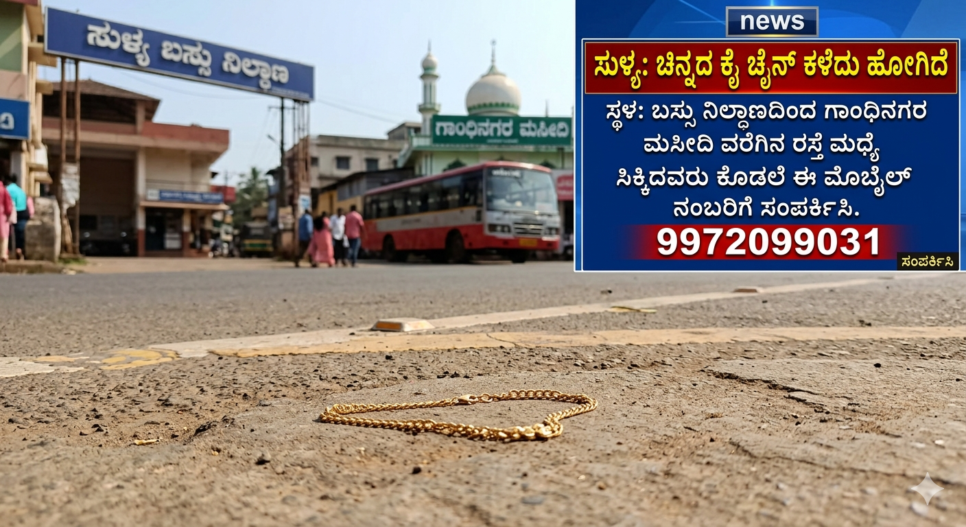 ಸುಳ್ಯ: ನಗರದ ಬಸ್ಸು ನಿಲ್ದಾಣದಿಂದ ಗಾಂಧಿನಗರ ಮಸೀದಿಗೆ ತೆರಳುವ ರಸ್ತೆಯ ಮಧ್ಯೆ ವ್ಯಕ್ತಿಯೊಬ್ಬರ ಚಿನ್ನದ ಕೈ ಚೈನ್ ಕಳೆದುಹೋಗಿದೆ.
