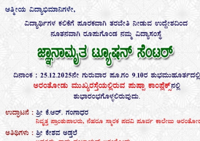 ವಿದ್ಯಾರ್ಥಿಗಳ ಕಲಿಕೆಗೆ ಪೂರಕವಾಗಿ ತರಬೇತಿ ನೀಡುವ ಉದ್ದೇಶದಿಂದ ನೂತನವಾಗಿ ರೂಪುಗೊಂಡ ವಿದ್ಯಾಸಂಸ್ಥೆ ಜ್ಞಾನಾಮೃತ ಟ್ಯೂಷನ್ ಸೆಂಟರ್ ಡಿ.25 ರಂದು ಅರಂತೋಡು ಮುಖ್ಯ ರಸ್ತೆಯಲ್ಲಿರುವ ಪುಷ್ಪಾ ಕಾಂಪ್ಲೆಕ್ಸ್ ನಲ್ಲಿ ಶುಭಾರಂಭ ಗೊಳ್ಳಲಿದೆ.ಅರಂತೋಡು ನೆಹರು ಸ್ಮಾರಕ ಪದವಿ ಪೂರ್ವ ಕಾಲೇಜು ನಿವೃತ ಪ್ರಾಂಶುಪಾಲ.ಕೆ. ಆರ್.ಗಂಗಾಧರ ಉದ್ಘಾಟಿಸಲಿದ್ದಾರೆ. ಅರಂತೋಡು ಗ್ರಾಮ ಪಂಚಾಯತ್ ಅಧ್ಯಕ್ಷ ಕೇಶವ ಆಡ್ತಲೆ,ಅರಂತೋಡು ತೊಡಿಕಾನ ಪ್ರಾಥಮಿಕ ಕೃಷಿ ಪತ್ತಿನ ಸಹಕಾರ ಸಂಘ ಅಧ್ಯಕ್ಷ ಸಂತೋಷ್ ಕುತ್ತಮೊಟ್ಟೆ,ಅರಂತೋಡು ನೆಹರು ಸ್ಮಾರಕ ಪದವಿ ಪೂರ್ವ ಕಾಲೇಜು ಮುಖ್ಯ ಶಿಕ್ಷಕ ಸೋಮ ಶೇಖರ ಪಿಂಡಿಮನೆ,ತೊಡಿಕಾನ ಮೆತ್ತಡ್ಕ ಪಾರೆಪ್ಪಾಡಿ ಕುಟುಂಬ ಹಿರಿಯರಾದ ಶ್ರೀನಿವಾಸ ಮೆತ್ತಡ್ಕ ,ಅರಂತೋಡು ಗ್ರಾಮ ಪಂಚಾಯತ್ ಸದಸ್ಯ ರವೀಂದ್ರ ಪಂಜಿ ಕೋಡಿ,ಕಟ್ಟಡ ಮಾಲಕ ಈಶ್ವರ ಉಳುವಾರು ಭಾಗವಹಿಸಲಿದ್ದಾರೆ. 8ರಿಂದ 10ನೇ ತರಗತಿಯ ವಿದ್ಯಾರ್ಥಿಗಳಿಗೆ ಗಣಿತ ವಿಜ್ಞಾನ ಮತ್ತು ಇಂಗ್ಲಿಷ್ ವಿಷಯಗಳಲ್ಲಿ ಮತ್ತು ವಿಜ್ಞಾನ ವಿಭಾಗದ ಪಿಯುಸಿ ವಿದ್ಯಾರ್ಥಿಗಳಿಗೆ ಎಲ್ಲ ವಿಷಯಗಳಲ್ಲಿ ಟ್ಯೂಷನ್ ನೀಡಲಾಗುವುದು. ಎಂದು ಕು. ಸುಷ್ಮಾ ಪತ್ರಿಕಾ ಪ್ರಕಟಣೆಯಲ್ಲಿ ತಿಳಿಸಿದ್ದಾರೆ.