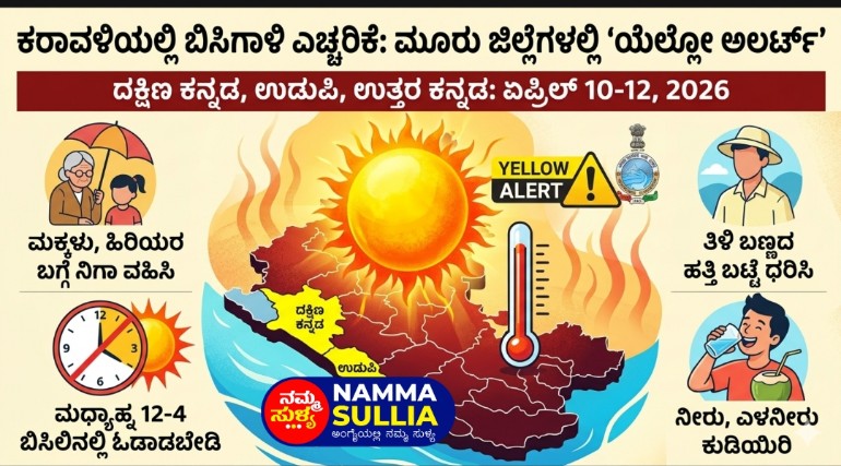 ಏಪ್ರಿಲ್ 10 ರಿಂದ 12 ರವರೆಗೆ ಕರಾವಳಿ ಕರ್ನಾಟಕದ ಪ್ರಮುಖ ಜಿಲ್ಲೆಗಳಾದ ದಕ್ಷಿಣ ಕನ್ನಡ, ಉಡುಪಿ ಮತ್ತು ಉತ್ತರ ಕನ್ನಡದಲ್ಲಿ ಸಾಮಾನ್ಯಕ್ಕಿಂತ ಅತಿ ಹೆಚ್ಚು ಉಷ್ಣಾಂಶ ದಾಖಲಾಗುವ ನಿರೀಕ್ಷೆಯಿದೆ. ಇದರ ಜೊತೆಗೆ ವಾತಾವರಣದಲ್ಲಿ ಹೆಚ್ಚಿನ ಆರ್ದ್ರತೆ (Humidity) ಇರಲಿದ್ದು, ಮೈ ಬೆವರುವ ಮತ್ತು ಉಸಿರುಗಟ್ಟಿಸುವ ವಾತಾವರಣ ನಿರ್ಮಾಣವಾಗಲಿದೆ. ಈ ತೀವ್ರತರವಾದ ಹವಾಮಾನ ವೈಪರೀತ್ಯದ ಹಿನ್ನೆಲೆಯಲ್ಲಿ ಹವಾಮಾನ ಇಲಾಖೆಯು ಈ ಮೂರೂ ಜಿಲ್ಲೆಗಳಿಗೆ ‘ಯೆಲ್ಲೋ ಅಲರ್ಟ್’ ಘೋಷಿಸಿದೆ.
