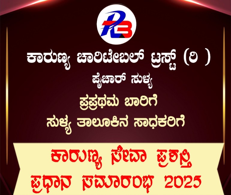 ಸುಳ್ಯ: ಕಾರುಣ್ಯ ಚಾರಿಟೇಬಲ್ ಟ್ರಸ್ಟ್ (ರಿ) ಪೈಚಾರ್ ಸುಳ್ಯ ಇದರ ವತಿಯಿಂದ, ಸುಳ್ಯದಲ್ಲಿ ಪ್ರಪ್ರಥಮ ಬಾರಿಗೆ ‘ಕಾರುಣ್ಯ ಸೇವಾ ಪ್ರಶಸ್ತಿ’ ಪುರಸ್ಕಾರ ಸಮಾರಂಭ ಇದೇ ಬರುವ ನವೆಂಬರ್ ತಿಂಗಳಲ್ಲಿ ನಡೆಯಲಿದೆ.