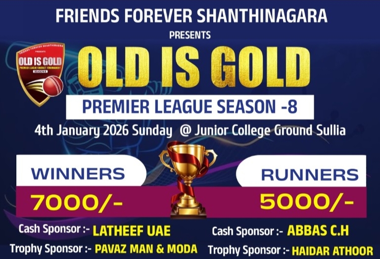 ಸುಳ್ಯ: ಫ್ರೆಂಡ್ಸ್ ಫಾರೆವರ್ ಶಾಂತಿನಗರ (Friends Forever Shanthinagara) ಇದರ ಆಶ್ರಯದಲ್ಲಿ “ಓಲ್ಡ್ ಈಸ್ ಗೋಲ್ಡ್ ಪ್ರೀಮಿಯರ್ ಲೀಗ್ ಸೀಸನ್-8” (Old Is Gold Premier League Season-8) ಕ್ರಿಕೆಟ್ ಪಂದ್ಯಾಟವು ಇದೇ ಬರುವ 2026ರ ಜನವರಿ 4ರಂದು ಭಾನುವಾರ ಸುಳ್ಯ ಶಾಂತಿನಗರ ಸ್ಟೇಡಿಯಂನಲ್ಲಿ ನಡೆಯಲಿದೆ.