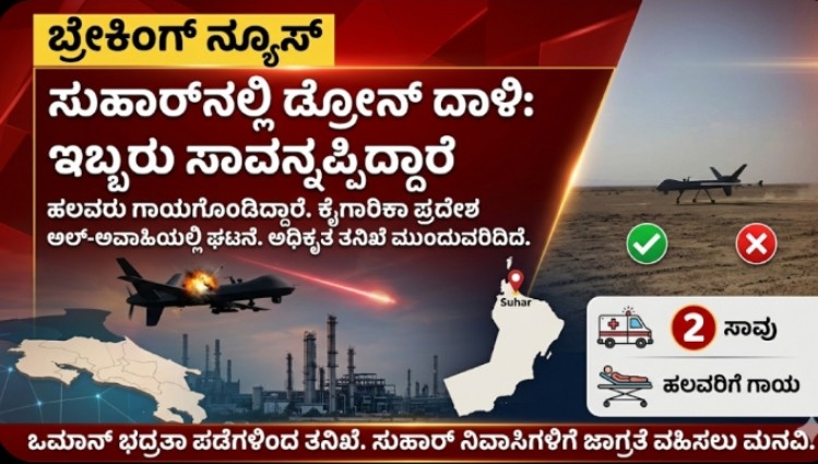 ಮಸ್ಕತ್: ಒಮಾನ್ನ ಸುಹಾರ್ ವಿಲಾಯತ್ನಲ್ಲಿ (Wilayat of Suhar) ಎರಡು ಡ್ರೋನ್ಗಳು ಅಪ್ಪಳಿಸಿವೆ ಎಂದು ಭದ್ರತಾ ಮೂಲಗಳು ವರದಿ ಮಾಡಿವೆ.
