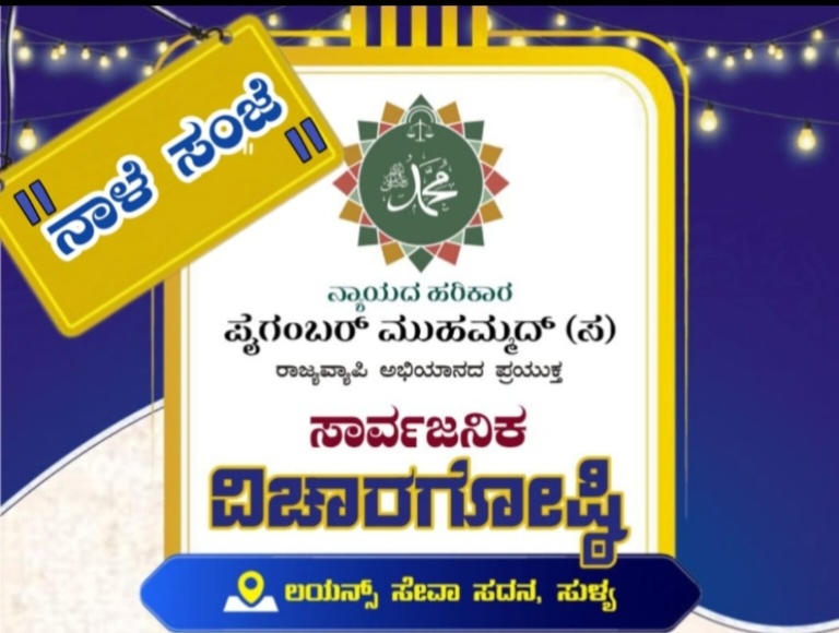 ನ್ಯಾಯದ ಹರಿಕಾರ ಪೈಗಂಬರ್ ಮುಹಮ್ಮದ್ (ಸ) ರಾಜ್ಯವ್ಯಾಪಿ ಅಭಿಯಾನದ ಪ್ರಯುಕ್ತ ಸಾರ್ವಜನಿಕ ವಿಚಾರಗೋಷ್ಠಿ ಕಾರ್ಯಕ್ರಮವು ನ.01 ಸಂಜೆ 4 ಗಂಟೆಗೆ ಸರಿಯಾಗಿ ಲಯನ್ಸ್ ಸೇವಾ ಸದನ ಸುಳ್ಯದಲ್ಲಿ ನಡೆಯಲಿದೆ. ಕಾರ್ಯಕ್ರಮದ ಅಧ್ಯಕ್ಷತೆಯನ್ನು ಜ| ಮುಹಮ್ಮದ್ ಕುಞಿ (ರಾಜ್ಯ ಕಾರ್ಯದರ್ಶಿ, ಜಮಾಅತೆ ಇಸ್ಲಾಮೀ ಹಿಂದ್) ವಹಿಸಲಿದ್ದಾರೆ. ಮುಖ್ಯ ಅತಿಥಿಗಳಾಗಿ ಡಾ ಕೆ.ವಿ ಚಿದಾನಂದ ( ಅಧ್ಯಕ್ಷರು, ಅಕಾಡೆಮಿ ಆಫ್ ಲಿಬರಲ್ ಎಜ್ಯುಕೇಷನ್), ಡಾ| ಪೂವಪ್ಪ ಕಣಿಯೂರು ( ಖ್ಯಾತ ಸಾಹಿತಿ, ಬರಹಗಾರರು), ಶ್ರೀ ಗಣೇಶ್ ಭಟ್ ಪಿ, (ಚಾರ್ಟಡ್ ಅಕೌಂಟೆಂಟ್, ಸುಳ್ಯ), ಶ್ರೀ ಲಕ್ಷ್ಮೀಶ ಗಬಲಡ್ಕ (ಸದಸ್ಯರು, ರಾಜ್ಯ ಧಾರ್ಮಿಕ ಪರಿಷತ್, ಕರ್ನಾಟಕ ಸರಕಾರ), ಶ್ರೀ ಹಿಮಕರ ಎ.ಕೆ. (ಸಾಹಿತಿ, ಸಂಶೋಧಕರು, ಗುತ್ತಿಗಾರು, ಸುಳ್ಯ) ಭಾಗವಹಿಸಲಿದ್ದಾರೆ. ಇದೊಂದು ಸರ್ವಧರ್ಮೀಯರಿಗೂ ಕಾರ್ಯಕ್ರಮವಾಗಿದ್ದು ಎಲ್ಲರಿಗೂ ಭಾಗವಹಿಸಬಹುದಾಗಿದೆ.