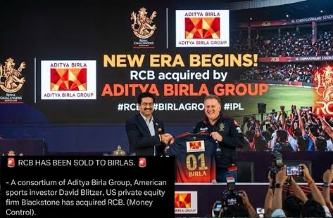 - ಹೊಸ ಮಾಲೀಕರು: ಆದಿತ್ಯ ಬಿರ್ಲಾ ಗ್ರೂಪ್, ಟೈಮ್ಸ್ ಆಫ್ ಇಂಡಿಯಾ (TOI), ಬೋಲ್ಟ್ ವೆಂಚರ್ಸ್ (ಡೇವಿಡ್ ಬ್ಲಿಟ್ಜರ್) ಮತ್ತು ಬ್ಲಾಕ್ಸ್ಟೋನ್ (Blackstone) ಸಂಸ್ಥೆಗಳನ್ನು ಒಳಗೊಂಡ ಕನ್ಸೋರ್ಟಿಯಂ (ಒಕ್ಕೂಟ) ಆರ್ಸಿಬಿ ಮಾಲೀಕತ್ವವನ್ನು ಪಡೆದುಕೊಂಡಿದೆ.