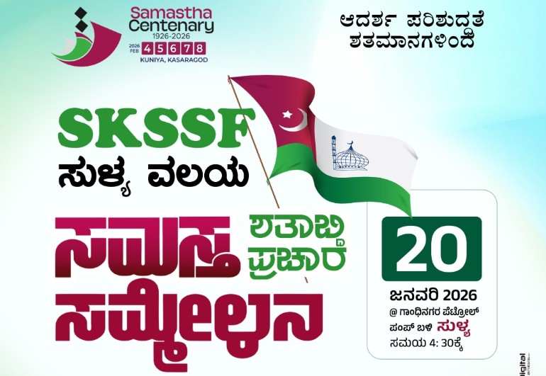 ಎಸ್ ಕೆ ಎಸ್ ಎಸ್ ಎಫ್ ಸುಳ್ಯ ವಲಯ ವತಿಯಿಂದ ಸಮಸ್ತ ಶತಮಾನೋತ್ಸವದ ಭಾಗವಾಗಿ ನಡೆಯಲ್ಲಿರುವ ಅಂತಾರಾಷ್ಟ್ರೀಯ ಮಹಾ ಸಮ್ಮೇಳನ ಇದರ ಪ್ರಚಾರ ಕಾರ್ಯಕ್ರಮ ಸುಳ್ಯ ಗಾಂಧಿ ನಗರ ಪೆಟ್ರೋಲ್ ಪಂಪು ಮುಂಭಾಗ ಜ. 20 ರಂದು ಸಂಜೆ ನಡೆಯಲಿದೆ.