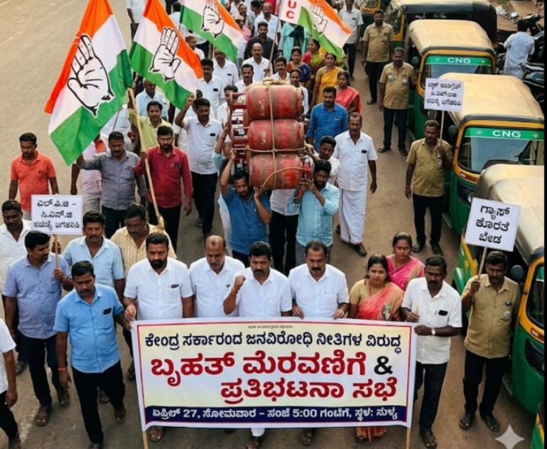 ಸುಳ್ಯ: ಕೇಂದ್ರ ಸರ್ಕಾರದ ಜನವಿರೋಧಿ ನೀತಿಗಳ ವಿರುದ್ಧ ಹಾಗೂ ಎಲ್.ಪಿ.ಜಿ (LPG) ಮತ್ತು ಸಿ.ಎನ್.ಜಿ (CNG) ಗ್ಯಾಸ್ ಪೂರೈಕೆಯಲ್ಲಿ ಉಂಟಾಗಿರುವ ವ್ಯತ್ಯಯವನ್ನು ಖಂಡಿಸಿ ಏಪ್ರಿಲ್ 27ರ ಸೋಮವಾರದಂದು ಸುಳ್ಯದಲ್ಲಿ ಬೃಹತ್ ಮೆರವಣಿಗೆ ಹಾಗೂ ಪ್ರತಿಭಟನಾ ಸಭೆಯನ್ನು ಹಮ್ಮಿಕೊಳ್ಳಲಾಗಿದೆ.